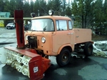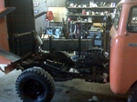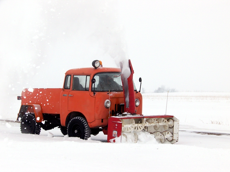 “Chomper’s” story Tech Specs: 1959 Jeep FC-150 F-head 134 4cyl T-90 3spd and T-case Stock Dana 44 axles 7 1/2 foot, twin auger McKee Brothers Sno-Lander snow blower. The blower is powered by a 230 HP, Dodge 360 V8 that runs a Dodge 4spd manual transmission locked in reverse with a drive shaft running through the cab to a set of pillow block bearings on the blower and a #60 chain drive down to the PTO shaft of the blower. “Chomper” started out as a high school shop project in Truckee CA. The shop class never finished it and the school eventually sold it to a gentleman in South Lake Tahoe CA who got it working. He used it for many years until he blew up the Dodge 360 that powers the blower. He dropped in a junkyard Dodge 440 big block but never finished it. Kim Kessler found it and took the first “The find” picture and posted it on the forum. It eventually came up for sale and I bought it. The following pictures on “The find” are minutes after it was unload from the transport from CA. The last picture is with it finally home still on the trailer. It was pretty hacked up in the front and a lot of BAD engineering but hey it worked. The 440 was junk and too big to fit under the cover correctly so I traded it for a good 360. It took 3 months to find the right bell housing to bolt up to the Dodge 4spd trans with the size clutch and flywheel. I got it running and working in time for the third snowfall of 2010. It was worth its weight for the remainder of the winter as we had record snow all winter!! Spring came and I started taking it apart to fix and rebuild the bad stuff. The nose had been torched out and so was the tunnel on the passenger side where the drive shaft runs through the cab. I replaced the grill area and rebuilt the floor and extended the tunnel to safely cover and protect the driveshaft. The hydraulic lift assembly was poorly made and weak so I cut it out and built a new mount that doesn’t flex under the weight of the blower. I wanted to keep the interior looking as original as possible at first glance. The overhead console houses the gauges for the 360 and all of the accessory switches. The skull shifter knob is the throttle control for the 360. The 360 is set to idle around 2000 rpm which throws snow about 10 feet away. When the snow gets deep I can throttle it up to 3000 rpm and it will shoot snow 20 feet in the air and 20 feet away. This summer I plan to remove the helper springs from the front springs and add airbags then strip it down to finish the interior and body work and get it painted. The name “Chomper” is not because it chomps through the snow. It came from “the land before time” cartoons my daughters used to watch. Chomper was a baby T-Rex that bit one of the other characters. From the moment I unloaded it from the trailer it fought me and I have the scars to show for it. When I was mocking up the new rear fenders I sliced my hand and I told Katie “he bit me!” Just like in the movie.