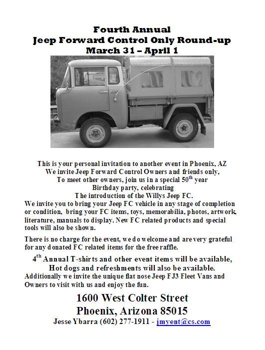 [ Home ] [ Up ] [ What's New ] [ FC Builds & Blogs ] [ Historical Literature ] [ MY Vehicles & Projects ] [ In the Movies & YouTube ] [ Items for Sale ] [ Contact Us ] [ FC Gallery ] [ FC Magazine Articles ] [ FC Links ] [ FC Auction Results ] [ FC Roundups & Get-Togethers ] [ Featured Vehicles ] [ In Memory Of ] [ FC Registry ] [ Forward Control History & General Information ] [ UPCOMING FORWARD CONTROL JEEP EVENTS ]