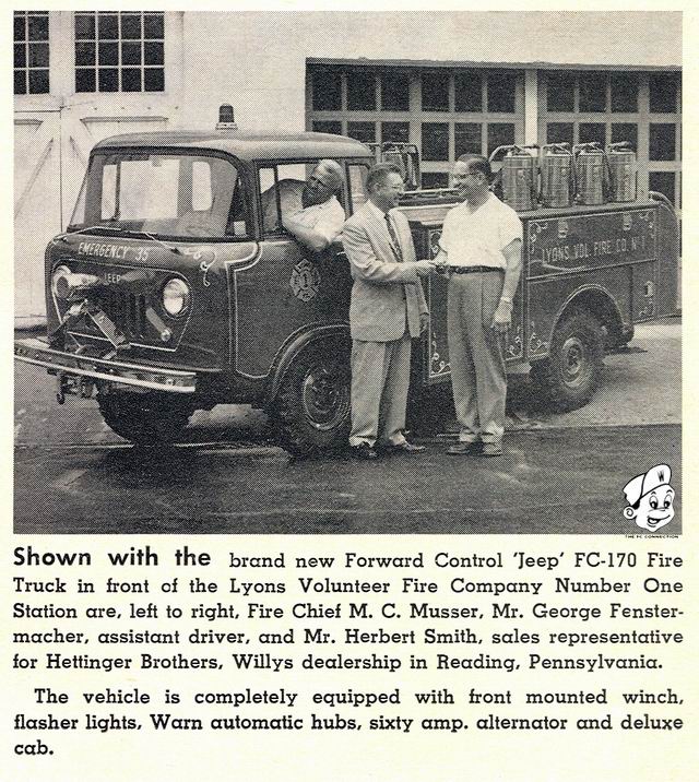 Some months ago Fire Chief M. C. Musser and other officers and members of the Lyons Volunteer Fire Company of the Reading, Pennsylvania area began looking for a comparatively short wheelbase maneuverable fire truck that could be depended on to go practically anywhere through mud, sand, snow and over ice-coated city streets and rural roads. It took only a demonstration by Mr. Herbert Smith, salesman for Hettinger Brothers, Willys dealership in Reading, to convince them that a big, sure-footed ‘Jeep’ FC-170 Truck was the answer. Their bright new ‘Jeep’ fire truck is not only the pride of the company but it provides the best go-any-where… any time assurance that is so essential to the emergency work of fire fighting. |