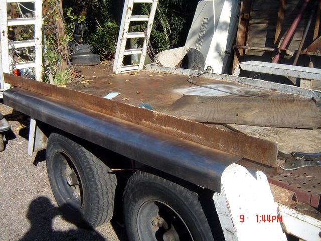 This shows the formed rocker panel awaiting a 90 degree bend on the top side to attach to the floor of the van. This was achieved by clamping the top of the rocker panel between 2 pieces of angle iron and folding over the top edge to finish off the panel. Now trim it to fit on both ends and your ready to go. |