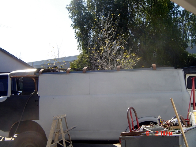 After Jesse attended the Military show it was back to work. The rear section was removed and the roof rails were installed. He really beefed them up and it may end up being strong enough for a viewing platform at the races when he's all done! |