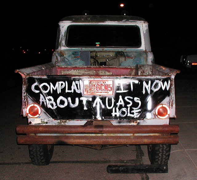 Well for all of you that read my MVD story about the jeep I am sure you will appreciate this. I was pretty happy to get the registration all taken care of. I figured I would not have any more issues with legalities anyway. Wrong. I got home yesterday to find out the Police had issued me a “fix it” citation for no registration. Come to find out my neighbor 2 houses down called the city and complained that I had a non-operational un-registered jeep at my house. They even knew I was having registration issues. Since it is registered until 2008 now I think it will sit in front of my place until then. So since they did not like the look of the jeep I decided to give it a “paint job”. I exercised my first amendment rights while I was at it. |