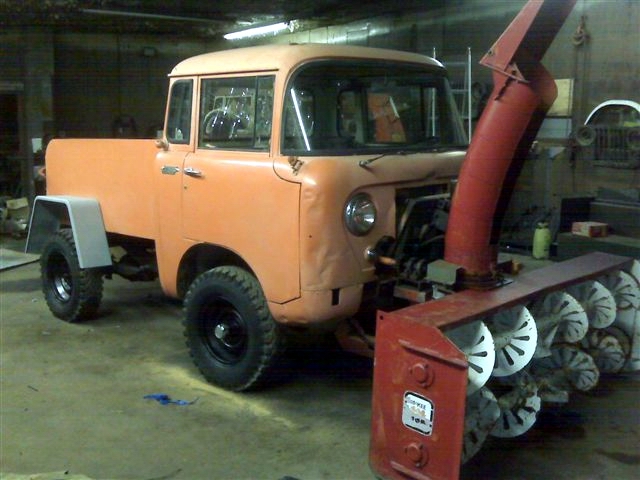 One of the first things Dan tackled was the lack of rear fenders. I believe these came from a trailer supply place and fit great! The rear blower engine cover is a rear tilt up style. Truck with blower unit removed. Blower driveshaft routing through the cab. Cover installed over blower driveshaft. F-head 134 4cyl with custom stainless steel overflow tank made by Dan.