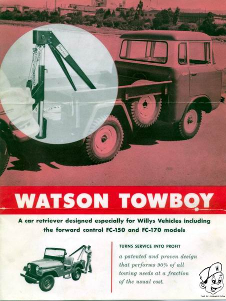 The Watson "Towboy" is a bolt-in, hand crank wrecker unit that was produced to help Garage owners move vehicles easily around the shop without tying up the big Wrecker that was used mainly for emergency vehicle retrieval. The Towboy unit was easily installed or removed in about 5 minutes from any vehicle and proved invaluable to many a Automotive shop owner. More pictures of the Towboy can be seen on the '57 FC-150 that I own. Here's a link to the truck. |